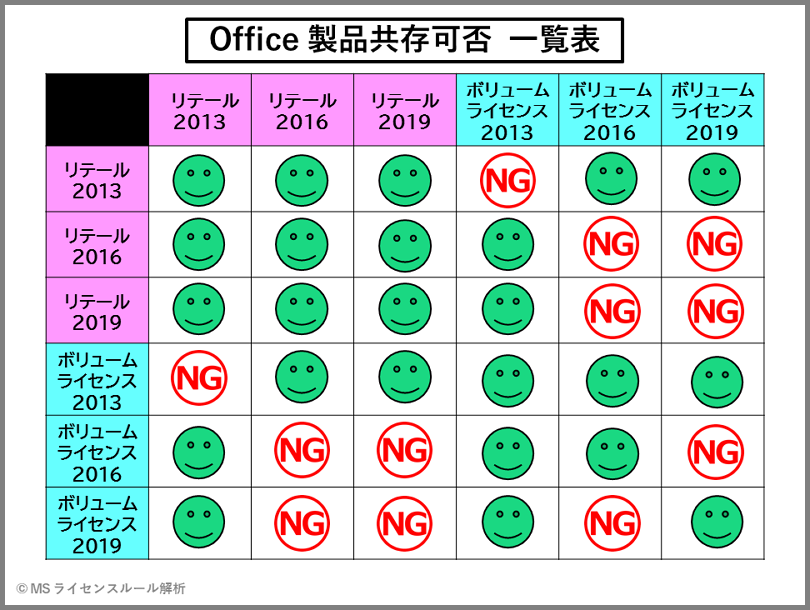 Office 2013以降から共存問題が出てきており、特にOffice 2016/2019になったから更に相性の幅が狭くなっているようで、クイック実行やWindowsインストーラー(MSI形式)との組み合わせとか、ボリュームライセンス版とリテール版の組み合わせとかなんかややこしい問題があるみたいです。以下の参考ページにどの組合せなら大丈夫なのか、わかりやすく図にまとめられています。